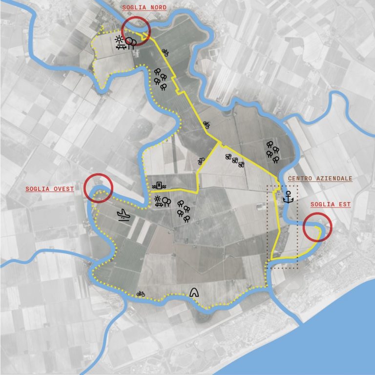 Il percorso è impreziosito da tre opere di "land art" realizzate da Alberto Garutti, che includono una soglia dorata che cambia tonalità con la luce del giorno, sculture che rappresentano animali della tenuta, e una scritta illuminata che aumenta d'intensità con i fulmini in Italia. Inoltre, è possibile visitare il centro aziendale di Genagricola con una cantina restaurata dove si possono degustare i vini locali.