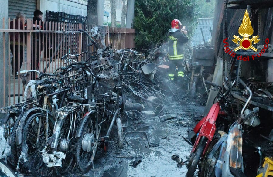 Notevoli i danni alla struttura e i cicli messi a deposito. Le cause del rogo sono al vaglio dei tecnici dei vigili del fuoco. Alla fine delle operazioni di bonifica l’officina sarà posta sotto sequestro. Sul posto anche i carabinieri.