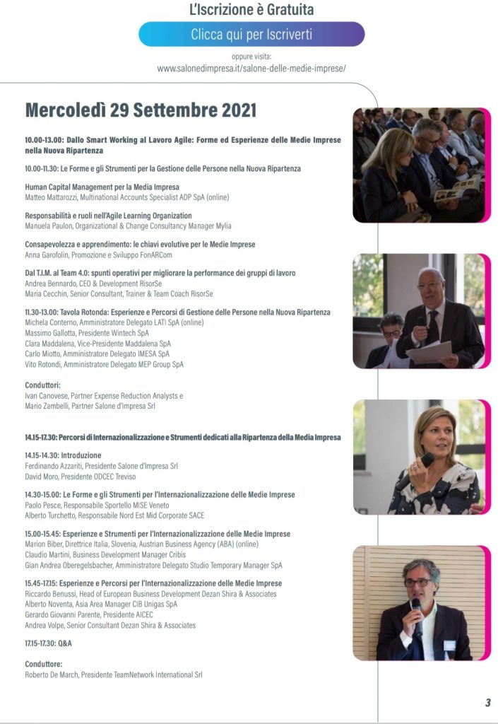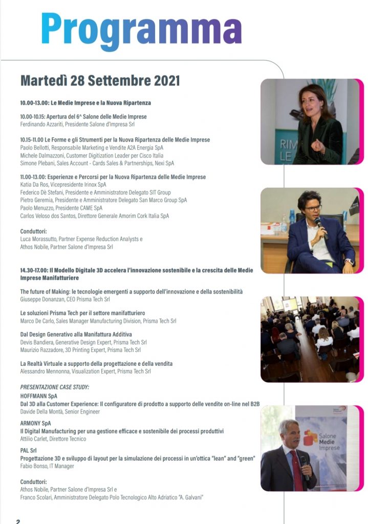Sarà una due giorni di convegni dedicati al mondo della media impresa con focus sulla nuova ripartenza. Giornate, durante le quali, si esploreranno forme, percorsi e strumenti utili per il rilancio. I temi focali di questa edizione del Salone, che saranno affrontati da relatori, imprenditori ed esperti, si rispecchiano nelle quattro sezioni in cui è diviso il programma: le medie imprese e la nuova ripartenza; l’innovazione sostenibile e la crescita delle medie imprese manifatturiere con il modello digitale 3D; dallo smart working al lavoro agile; percorsi di internazionalizzazione e strumenti dedicati alla ripartenza della media impresa