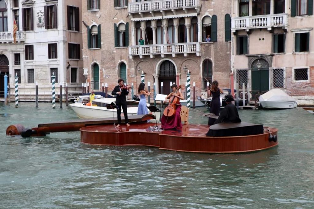 Sul monumentale strumento (12 m di lunghezza, 4 m larghezza e 1 m altezza) si è esibito un gruppo di musicisti. La scultura, preceduta da tre mascarete a remi e seguita da alcune gondole è partita da Ca' Farsetti alla volta di Palazzo Grassi e poi Palazzo Guggenheim.