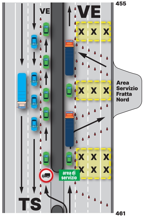 Gli utenti della strada dovranno prestare particolare attenzione, anche perché lo scambio di carreggiata sarà a cavallo dell’area di servizio di Fratta Nord. Pertanto - come da mappa allegata – i mezzi leggeri diretti all’area di servizio non dovranno “imboccare” lo scambio di carreggiata ma mantenersi sulla destra, al pari di tutti i mezzi pesanti che superano le 3,5 tonnellate. Code e disagi saranno inevitabili, ma questo passaggio è necessario per consentire da un lato di mantenere sempre in esercizio l’autostrada e dall’altro di concludere i lavori in questi primi cinque chilometri della terza corsia tra Alvisopoli e Portogruaro entro fine luglio, ovvero prima del grande esodo estivo.