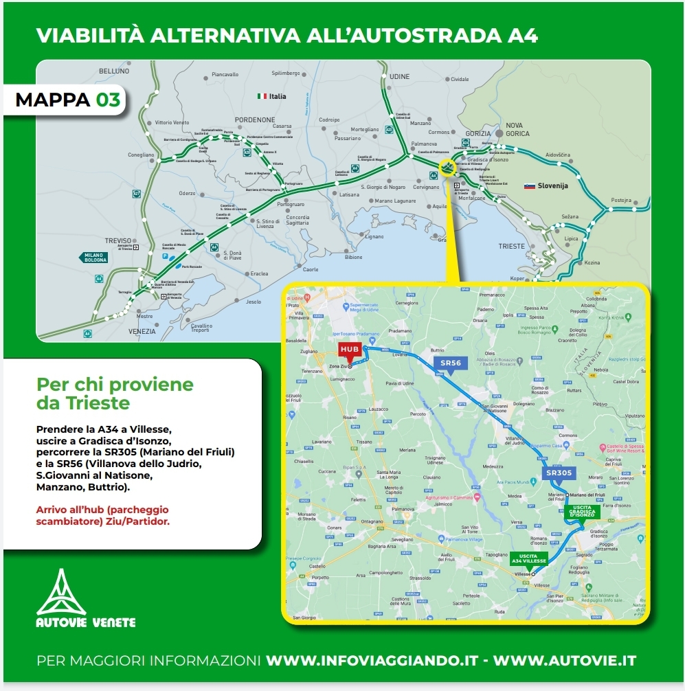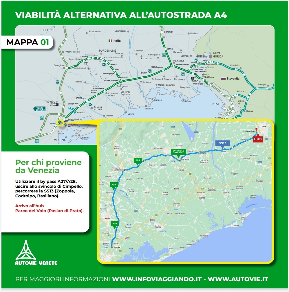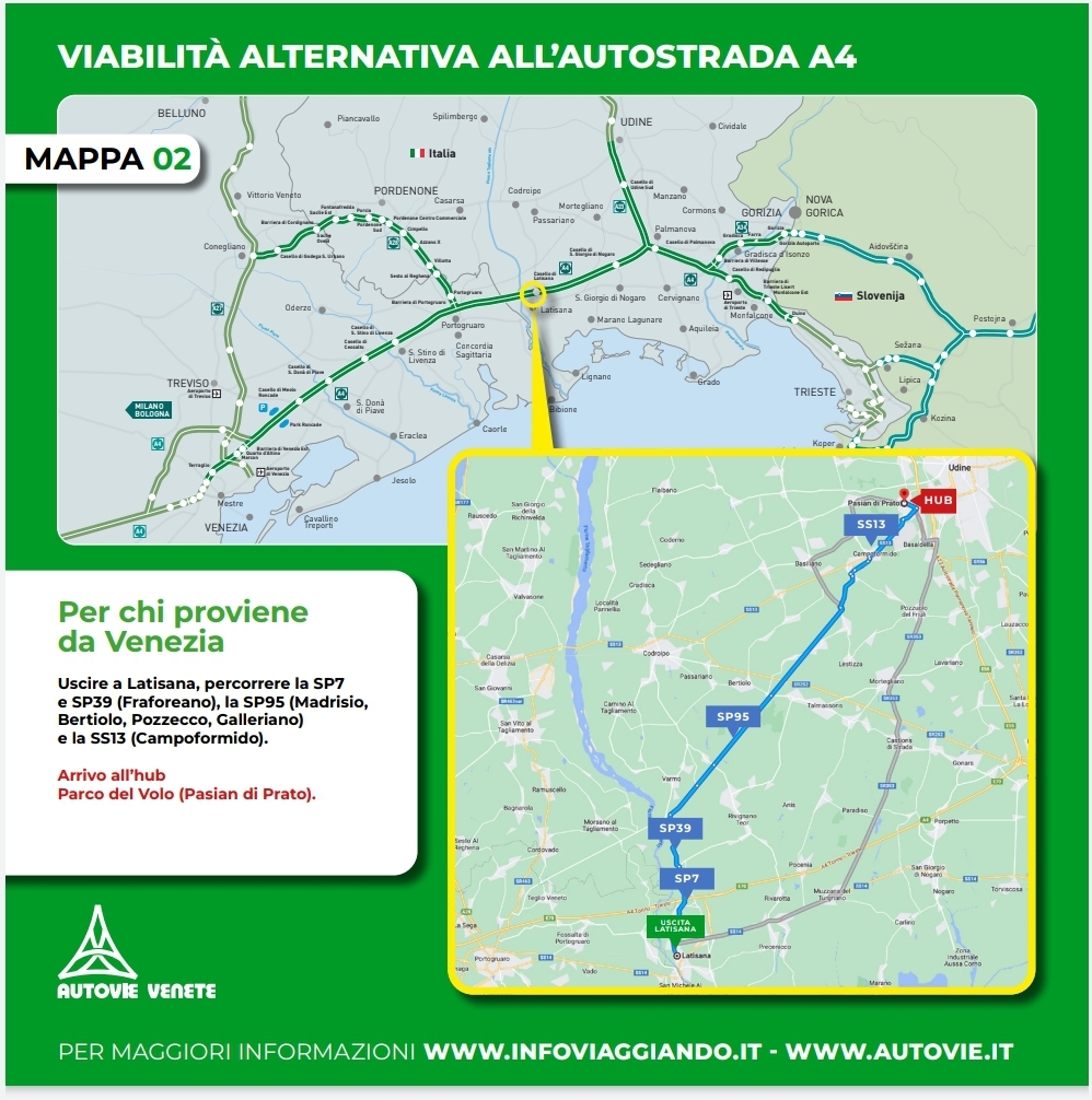 Per far fronte a questo piano e farsi trovare pronti a ogni eventuale emergenza, Autovie Venete – di concerto con Autostrade per l’Italia - ha predisposto tre itinerari alternativi in caso di traffico particolarmente intenso, con destinazione finali gli hub dei parcheggi scambiatori posizionati alle porte della città (come si evince dai grafici allegati). I primi due itinerari prendono in considerazione un eventuale scenario di criticità sulla carreggiata est (da Venezia a Udine/Trieste). Il primo percorso prevede il reindirizzamento dei mezzi sulla A27 e quindi sulla A28 con uscita consigliata a Cimpello e direzione strada statale 13 “Pontebbana” fino all’hub di Pasian di Prato (Campo del Volo); il secondo percorso prevede l’uscita a Latisana con direzione strada provinciale 95 “Ferrata” e arrivo sempre a Pasian di Prato. Il terzo itinerario considera un afflusso notevole lungo la direttrice ovest (da Trieste a Udine/Venezia). In questo caso l’uscita consigliata è Villesse/Gradisca d’Isonzo con direzione strade regionali 305 (Mariano) e 56 (Manzano-Buttrio) e arrivo all’hub Ziu/Partidor.