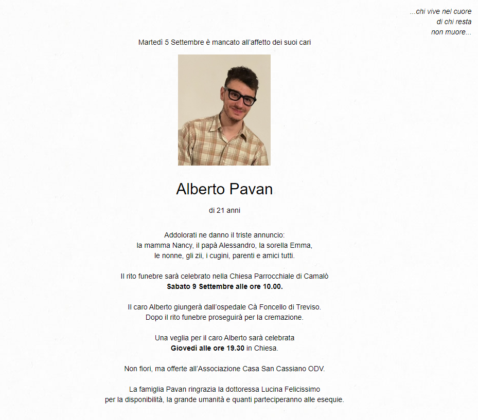 La famiglia ha deciso di indirizzare eventuali donazioni verso l’associazione Casa San Cassiano, piuttosto che accettare fiori. Fondata nel 2006 a Quinto di Treviso, Casa San Cassiano riunisce volontari e professionisti con l’intento di offrire sostegno alle persone e alle famiglie che affrontano situazioni di difficoltà.