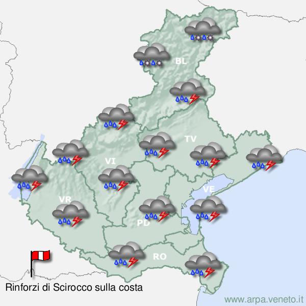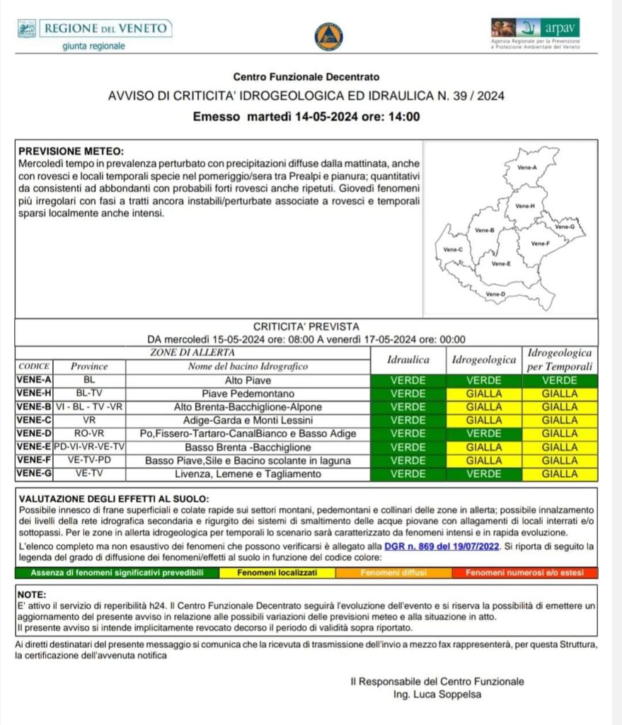 Domani, 15 maggio 2024, e giovedì 16 maggio il Veneto sarà interessato da un'allerta meteo gialla a causa di piogge abbondanti e condizioni meteorologiche avverse. Secondo le previsioni, il tempo sarà prevalentemente perturbato con precipitazioni diffuse sin dalla mattinata. Sono attesi rovesci e temporali locali, in particolare tra le Prealpi e la pianura nel pomeriggio e sera.