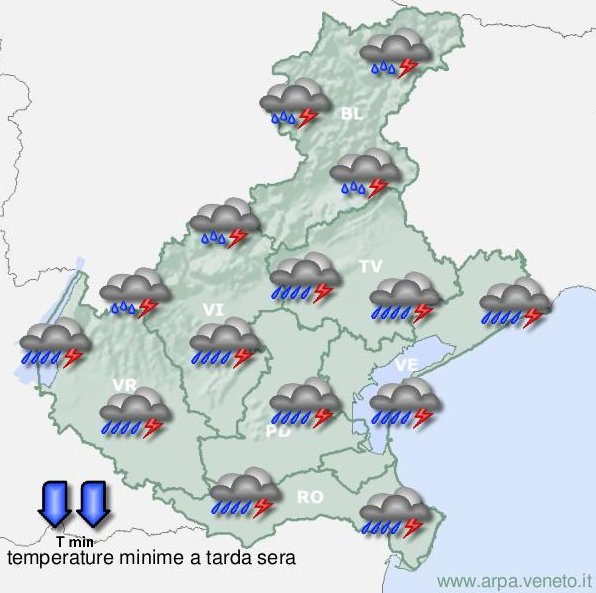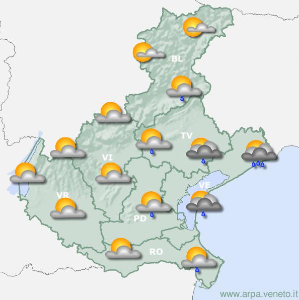 Dalle prime ore della giornata, precipitazioni significative inizieranno a manifestarsi nelle zone occidentali e meridionali del Veneto. Questi fenomeni, previsti in aumento nel corso della mattinata, interesseranno in modo crescente e diffuso l'intera regione. Il tempo sarà caratterizzato da perturbazioni estese, con rovesci e temporali che potranno risultare particolarmente intensi, soprattutto nelle aree delle Prealpi, nella pianura e lungo la costa.