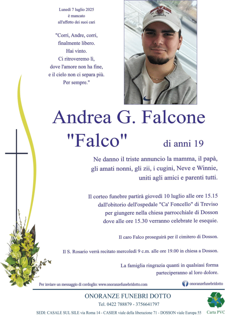 DOSSON (TREVISO) – La comunità di Frescada è stata colpita da un profondo dolore per la scomparsa di Andrea Falcone, appena 19 anni. Il giovane si è spento lunedì dopo aver affrontato con grande forza un tumore raro, il sarcoma di Ewing, una patologia che lo accompagnava da cinque anni.