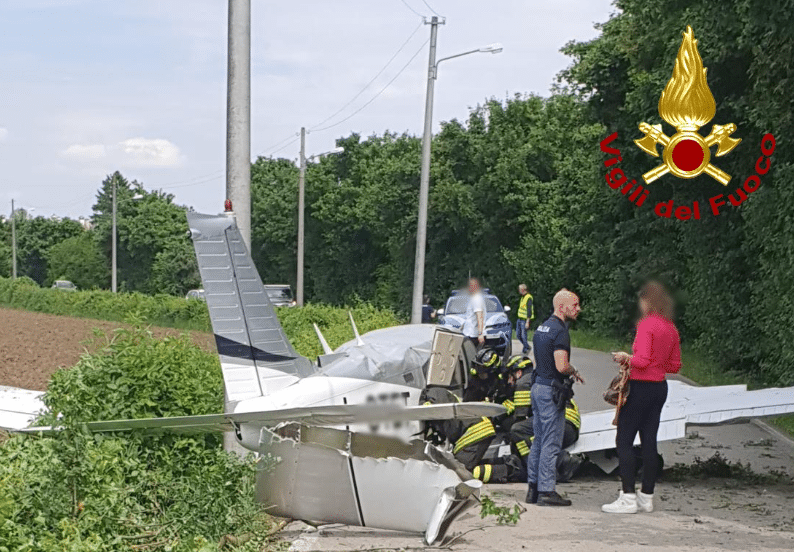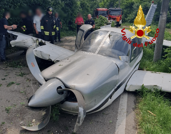 Aereo da turismo costretto all’atterraggio in strada: colpiti cavi elettrici e alberi. Tutte le immagini.