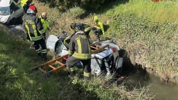 Auto si scontrano e finiscono in un fossato d'acqua: tre feriti bloccati nei veicoli, uno elitrasportato