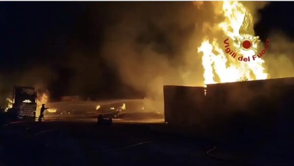Maxi incendio in un'azienda che lavora il legno: a fuoco anche 2 mezzi pesanti