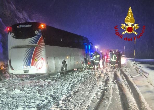 Un'auto e due autobus bloccati sotto un'abbondante nevicata nella notte: soccorsi