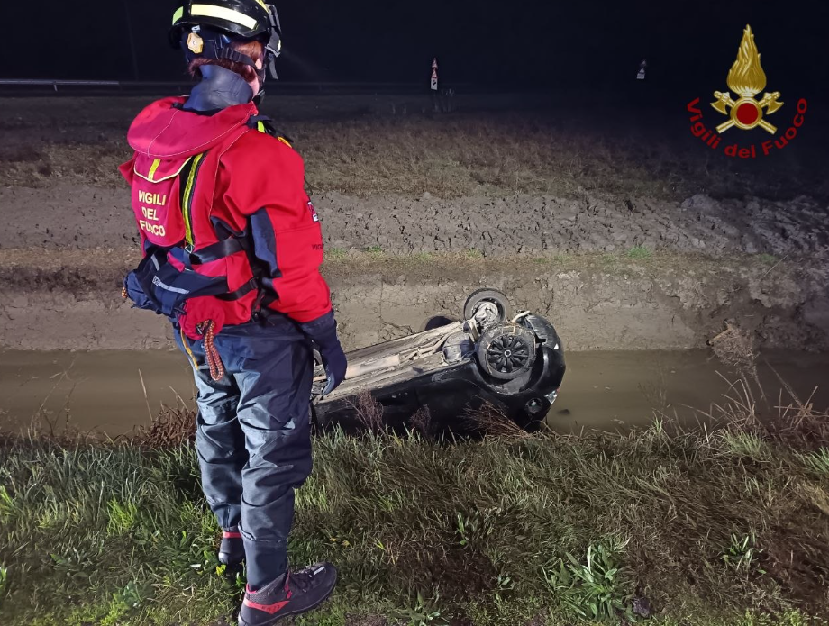 CANDA (RO) – Attimi di forte apprensione nella notte lungo via Guglielmo Marconi a Canda, nei pressi dell’imbocco della Transpolesana, dove un’auto è finita fuori strada terminando la corsa capovolta in un canale che costeggia la carreggiata. L’allarme è scattato poco dopo l’una, quando i Vigili del Fuoco del Comando di Rovigo sono stati chiamati a intervenire per un sinistro che ha richiesto un tempestivo dispiegamento di mezzi e personale.