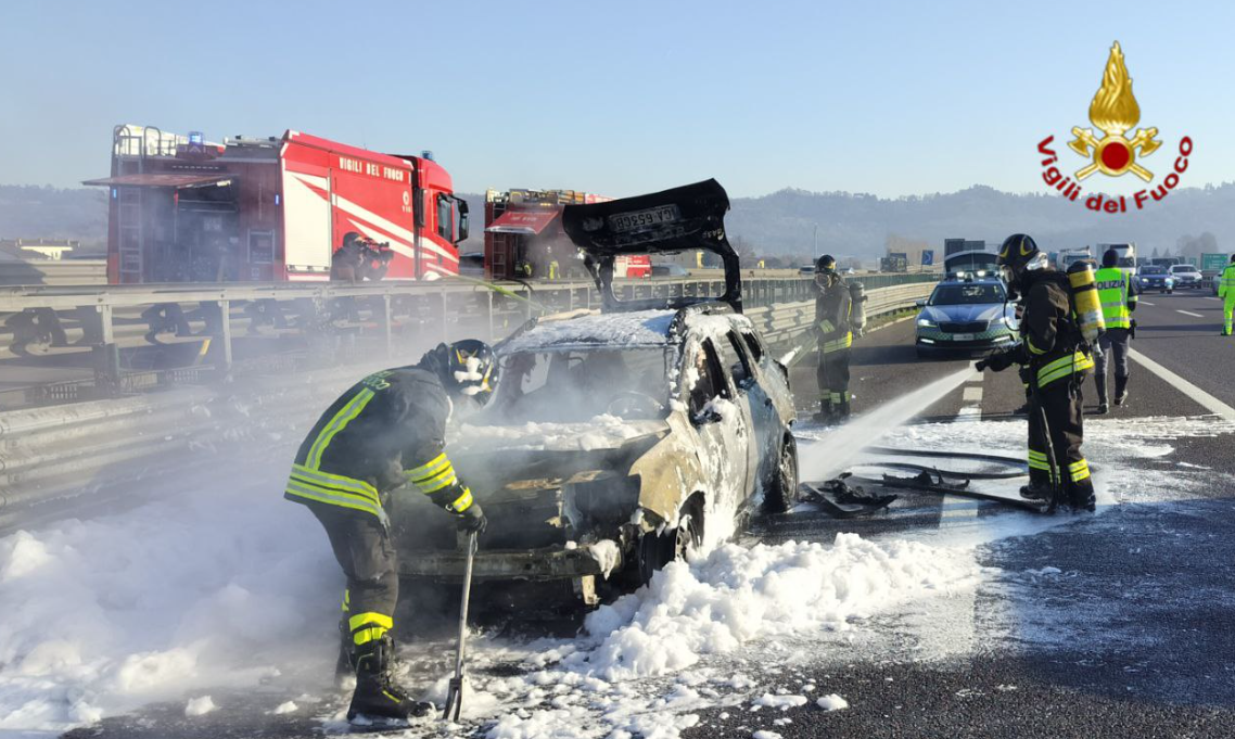 Auto in fiamme sull’A4 vicino a Vicenza Ovest: intervento rapido dei vigili del fuoco e nessun ferito.