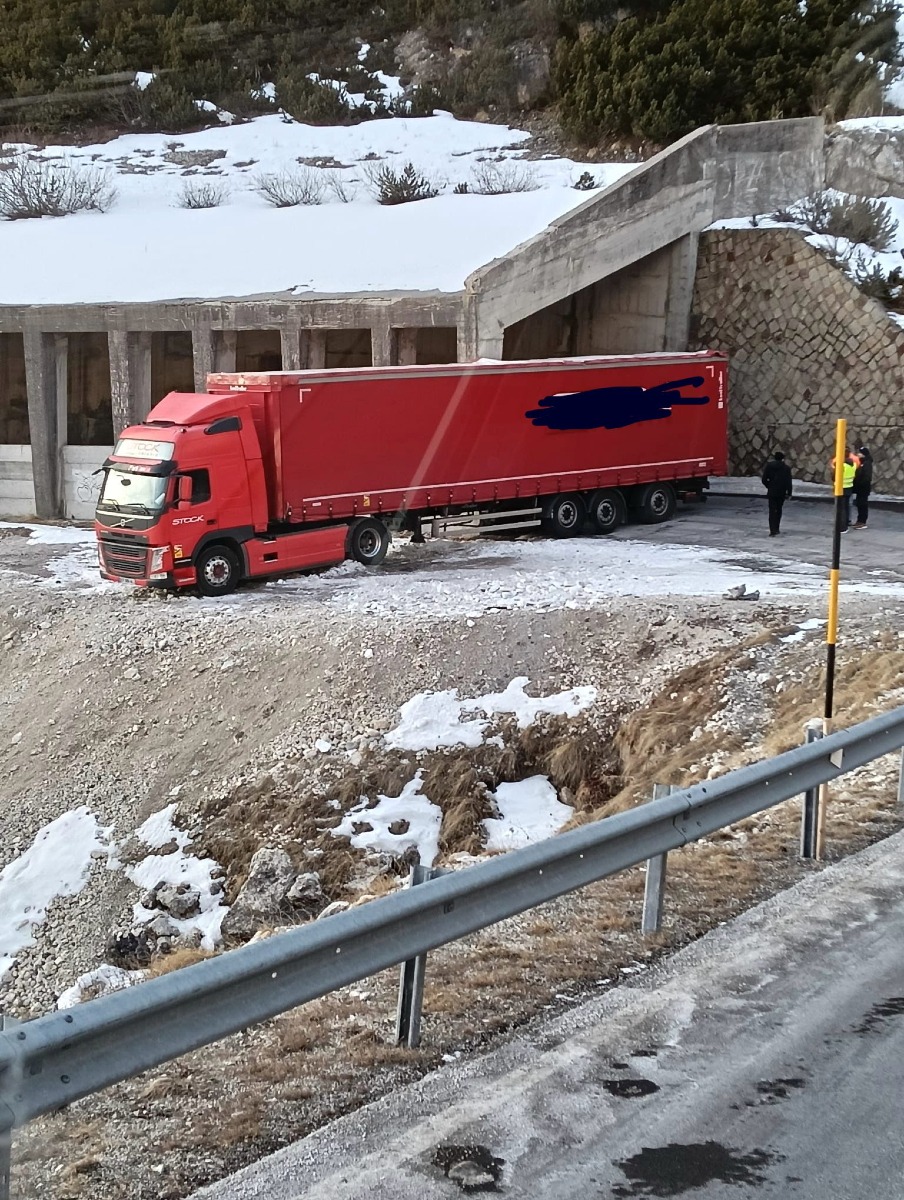 LIVINALLONGO DEL COL DI LANA (BL)Autoarticolato in blocco sulla carreggiata al km 105+400 della SR 48, nel territorio comunale di Livinallongo del Col di Lana, nel tratto compreso tra località Piani di Falzarego e Passo Falzarego.