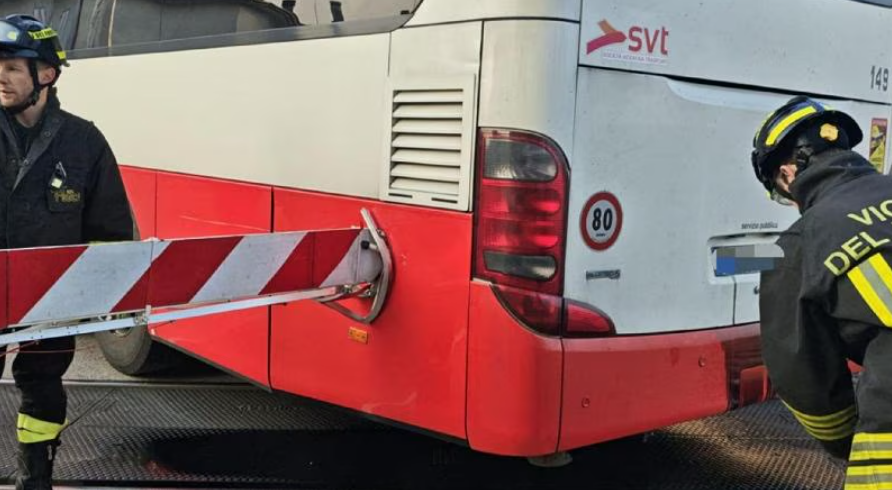 Sul mezzo, a bordo studenti, una sbarra del passaggio a livello ha perforato il vano motore, causando una perdita di olio sulla carreggiata. I Vigili del Fuoco di Vicenza hanno contenuto il liquido con materiale assorbente e liberato l’autobus tramite strumenti da taglio, senza registrare feriti tra i passeggeri.
