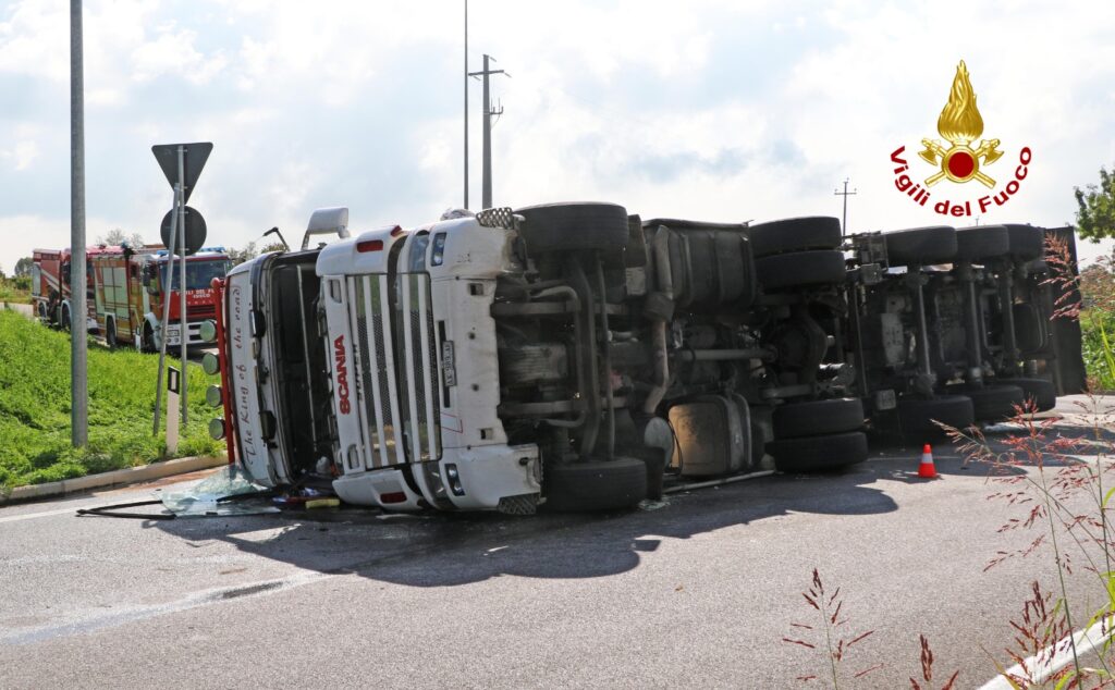 Autocisterna del latte si ribalta alla rotonda: ferito il conducente -