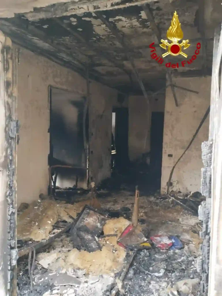 L’appartamento da cui è scaturito il rogo è completamente distrutto. Il calore ha danneggiato anche la struttura in laterizio del soffitto, compromettendo l’integrità dell’abitazione.