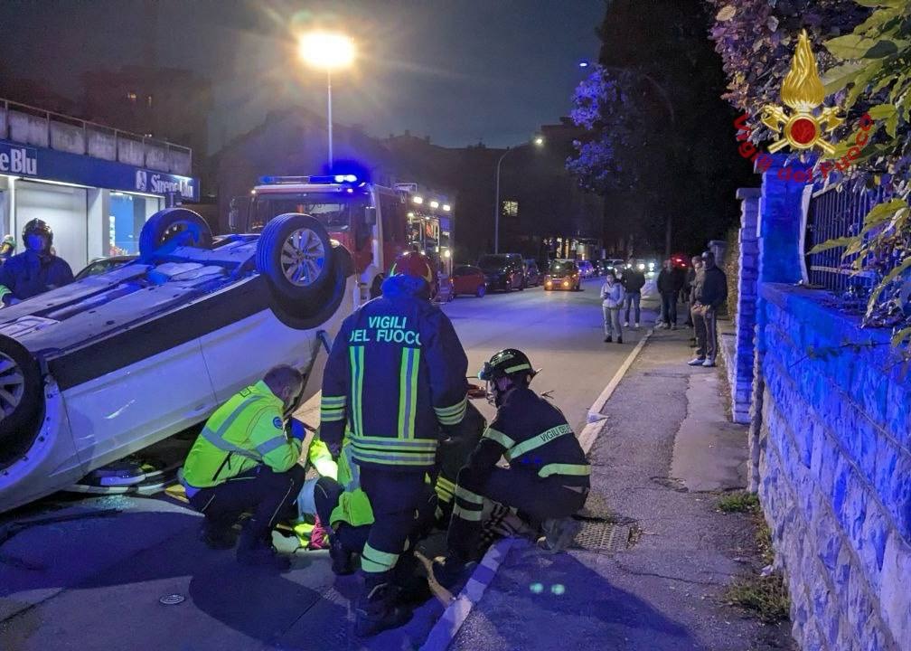 Auto ribaltata in via Feltre a Belluno dopo un urto con una vettura in sosta: conducente ferita portata in ospedale.