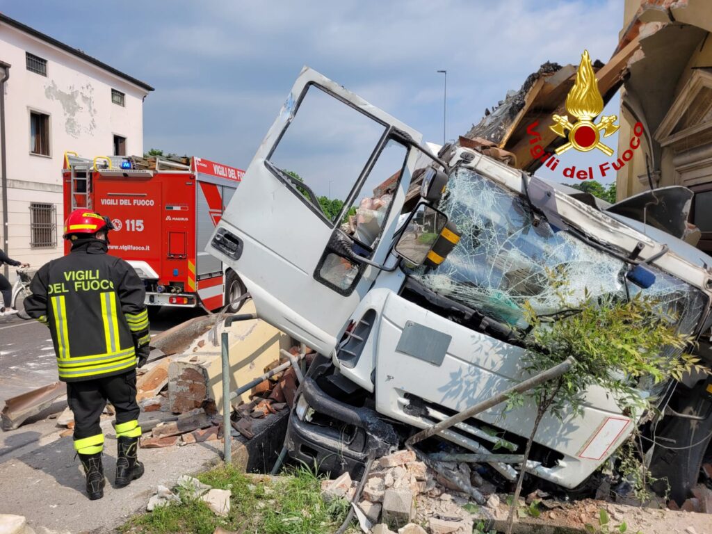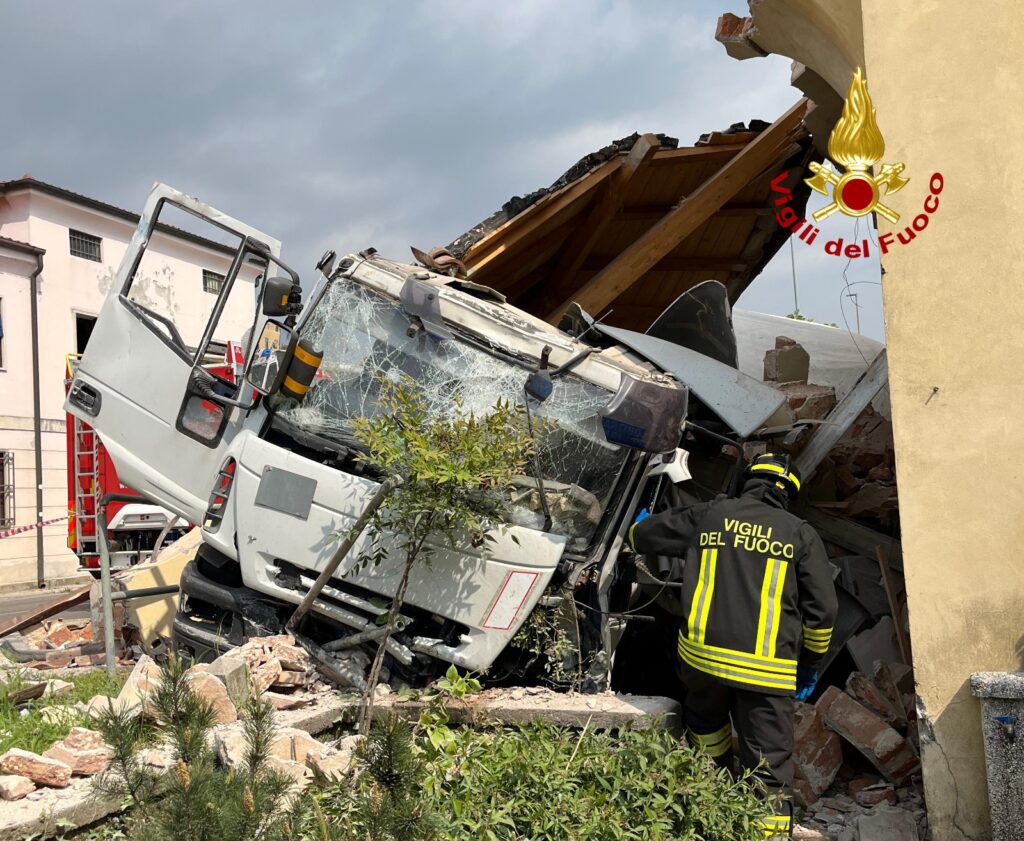 Il mezzo pesante stava viaggiando verso il centro di Vicenza, quando per cause in corso di accertamento è finito dalla parte opposta della strada abbattendo il portico.