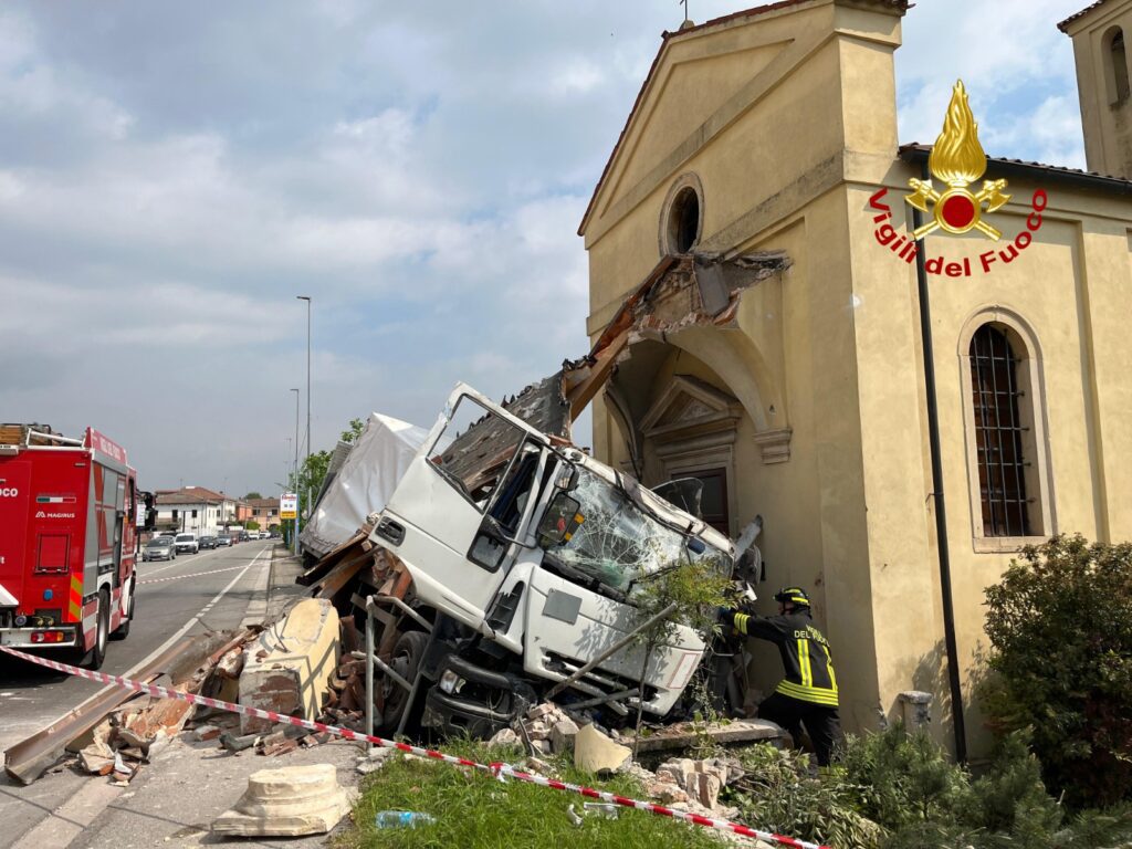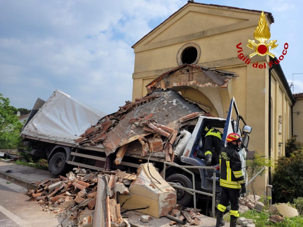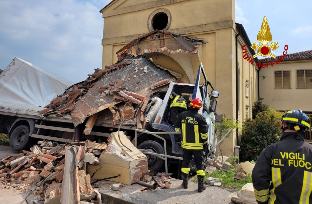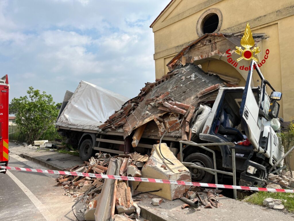 Camion piomba contro una chiesetta, portico demolito: due feriti