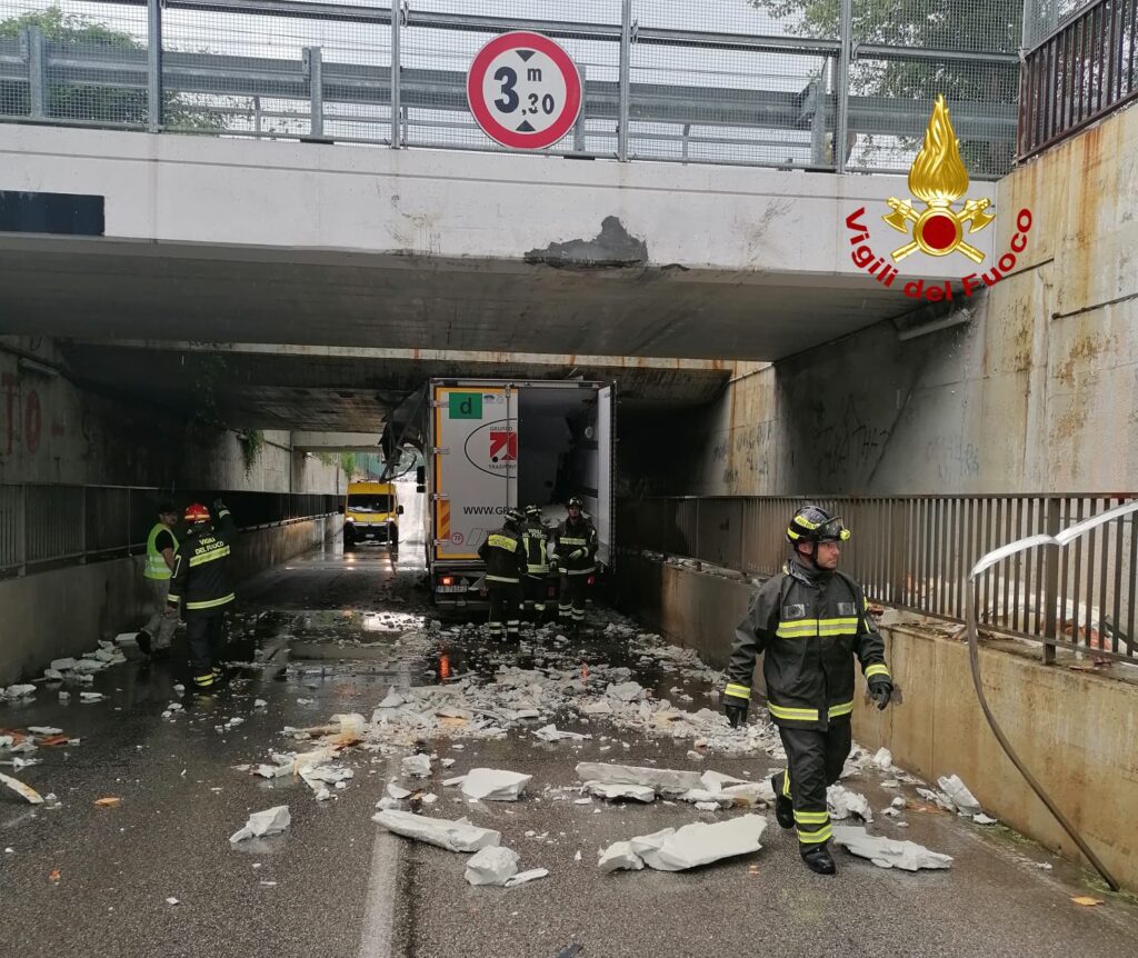 VILLORBA (TREVISO). Da poco prima delle 13:00, di martedì 4 giugno, i vigili del fuoco stanno operando nel sottopasso ferroviario di Via Selghere a Villorba per un camion frigo rimasto incastrato con il cassone per aver calcolato male l’altezza del mezzo.
