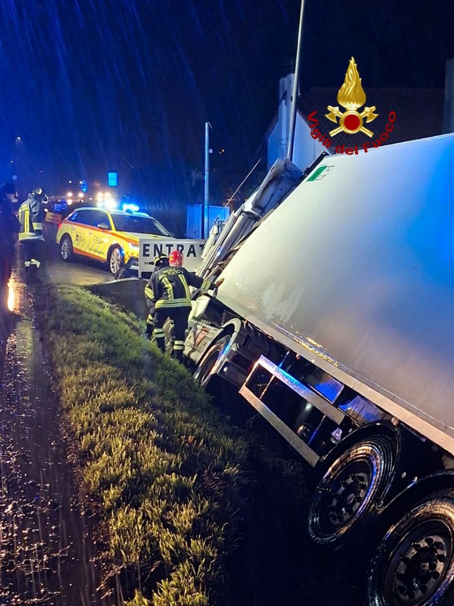 Incidente notturno a Ospedaletto Euganeo sulla SR Padana Inferiore: camion fuori strada, autista ferito soccorso dai Vigili del fuoco.
