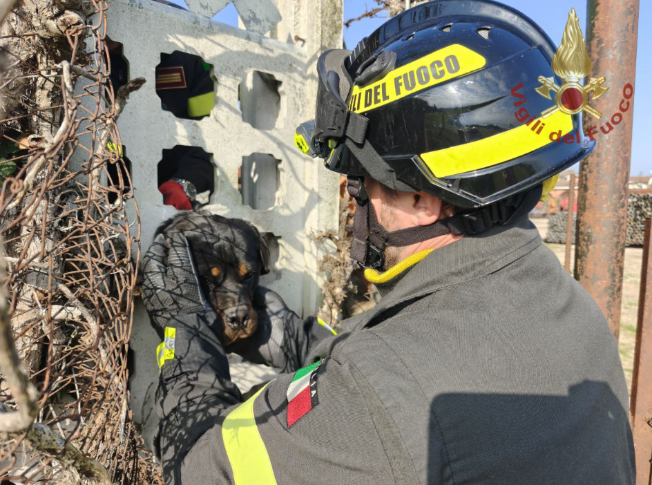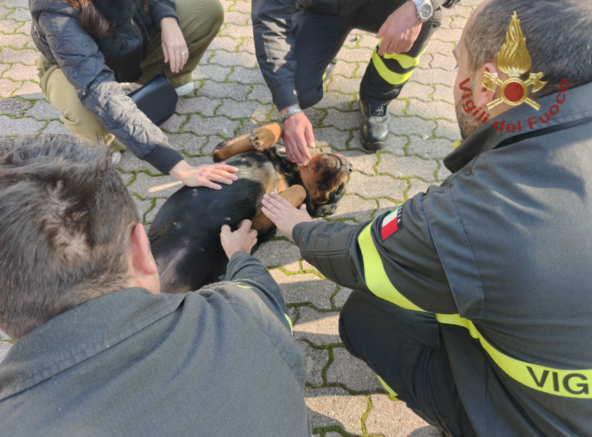 Rottweiler incastrata in recinzione salvata dai Vigili del fuoco a Isola della Scala, felice il giorno del suo compleanno.