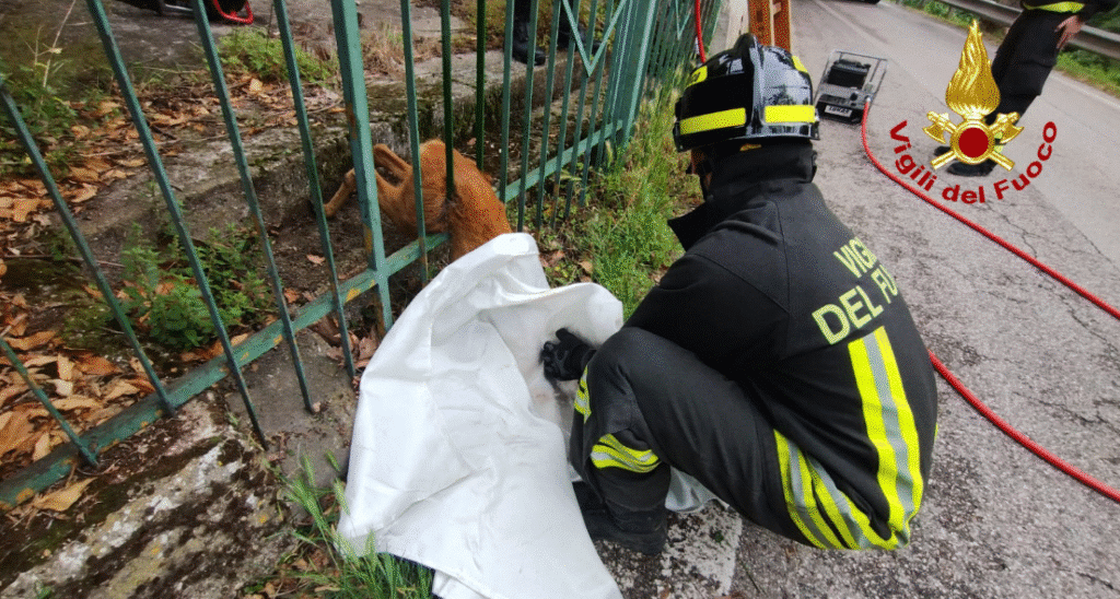 Una squadra dei vigili del fuoco è arrivata da Lonigo e ha agito con tempestività: gli operatori hanno coperto l’animale con un telo per calmarlo e ridurre lo stress, quindi hanno utilizzato un divaricatore meccanico per allargare le sbarre in modo da liberarlo senza ulteriori traumi. Le operazioni sono state delicate ma efficaci, e l’intervento si è concluso con successo.