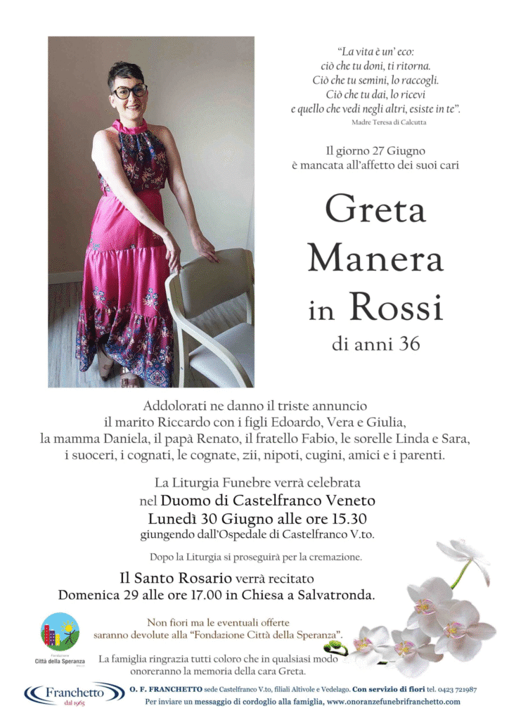CASTELFRANCO VENETO (TREVISO) – Profondo cordoglio nella comunità per la scomparsa di Greta Manera, 36 anni, madre di tre figli. La donna si è spenta venerdì presso l’hospice di Castelfranco, dopo un rapido peggioramento delle sue condizioni di salute. Accanto a lei, fino all’ultimo momento, il marito Riccardo, noto consulente finanziario della zona, con cui Greta si era unita in matrimonio appena a inizio giugno.