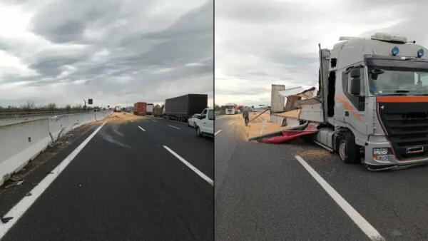 Scoppia la gomma in A4: mezzo pesante piomba contro i new jersey e perde 40 quintali di granaglie
