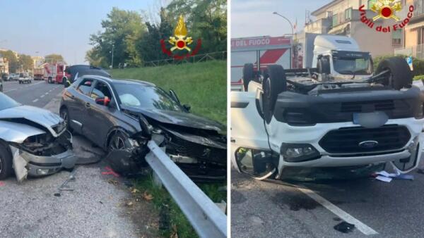 Tremendo scontro tra due auto e un furgone finito rovesciato: 3 feriti