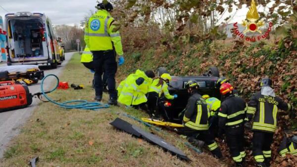 Finisce con l'auto nel fossato e si ribalta: donna incastrata tra le lamiere, ferita