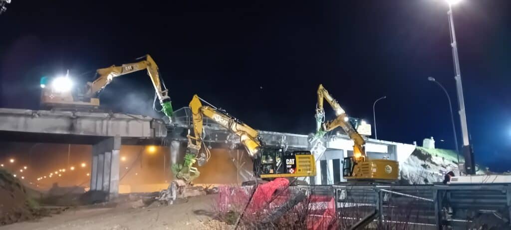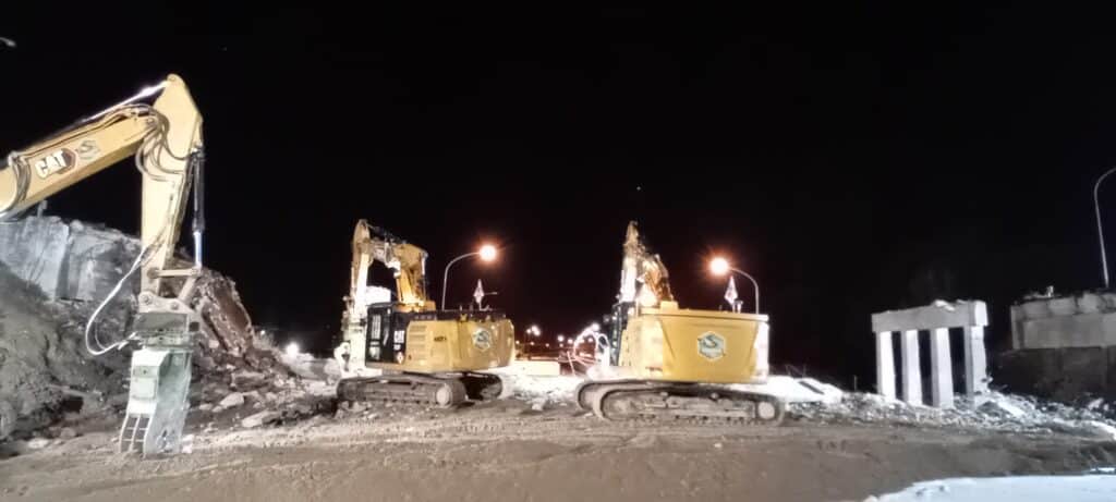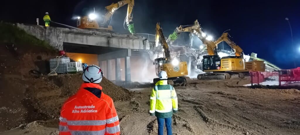 Dopo la chiusura dell’autostrada alle ore 20,00 di sabato 1 febbraio, sono state spostate le barriere di sicurezza ed è stato steso il telo ricoperto di un “letto” di sabbia per attutire la caduta dei detriti dall’alto e salvaguardare quindi la pavimentazione sottostante. Tutte operazioni propedeutiche e necessarie per l’entrata in azione degli escavatori che, dotati di cesoie e martelli, hanno operato nell’area a partire dalle ore 21,30. Con l’intervento di nebulizzatori si è anche impedito lo spargimento delle polveri nell’aria, determinate dalle demolizioni. Alle 23,00 il manufatto era stato demolito.