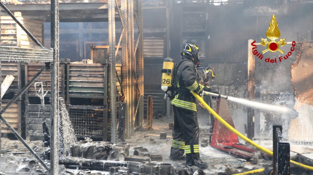 Dopo circa due ore le squadre sono riuscite a circoscrivere l’incendio, che ha interessato la quasi totalità della struttura ad eccezione degli uffici. Il tetto e le strutture in lamiera sono in più parti collassate.