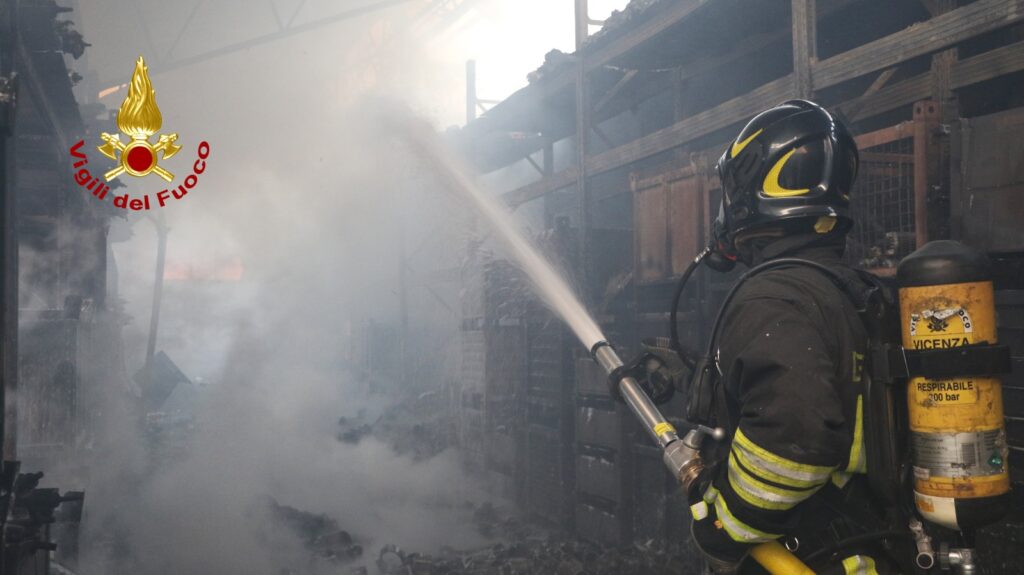 I vigili del fuoco arrivati nell’immediatezza dalla centrale di Vicenza e Arzignano e a seguire da Lonigo, Schio, Verona e i volontari di Thiene con 6 autopompe, 5 autobotti, un’autoscala, il carro aria e 32 operatori coadiuvati da funzionario di guardia, hanno iniziato le operazioni di spegnimento del rogo già generalizzato.