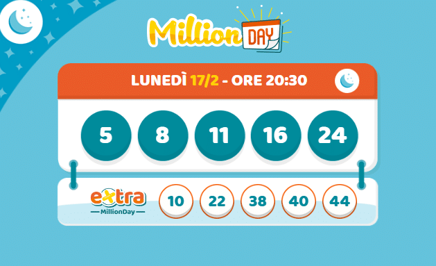 Scopri i numeri vincenti di oggi, lunedì 17 febbraio 2025, per Million Day e Million Day Extra. Estrazione ore 20:30.