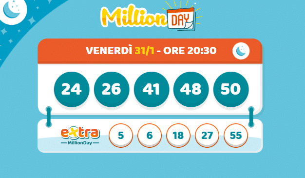 Scopri i numeri vincenti del Million Day e Million Day Extra di venerdì 31 gennaio 2025. Segui l'estrazione delle ore 20:30 e scopri se hai vinto 1 milione di euro.