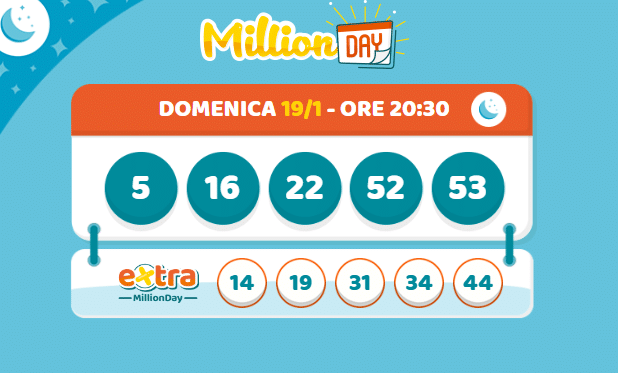 Scopri i numeri vincenti del Million Day e Million Day Extra di oggi, domenica 19 gennaio 2025, e tutte le informazioni su come partecipare.