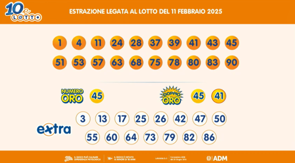 La combinazione vincente del 10eLotto serale con numeri oro, doppio oro e extra di martedì 11 febbraio 2025:
