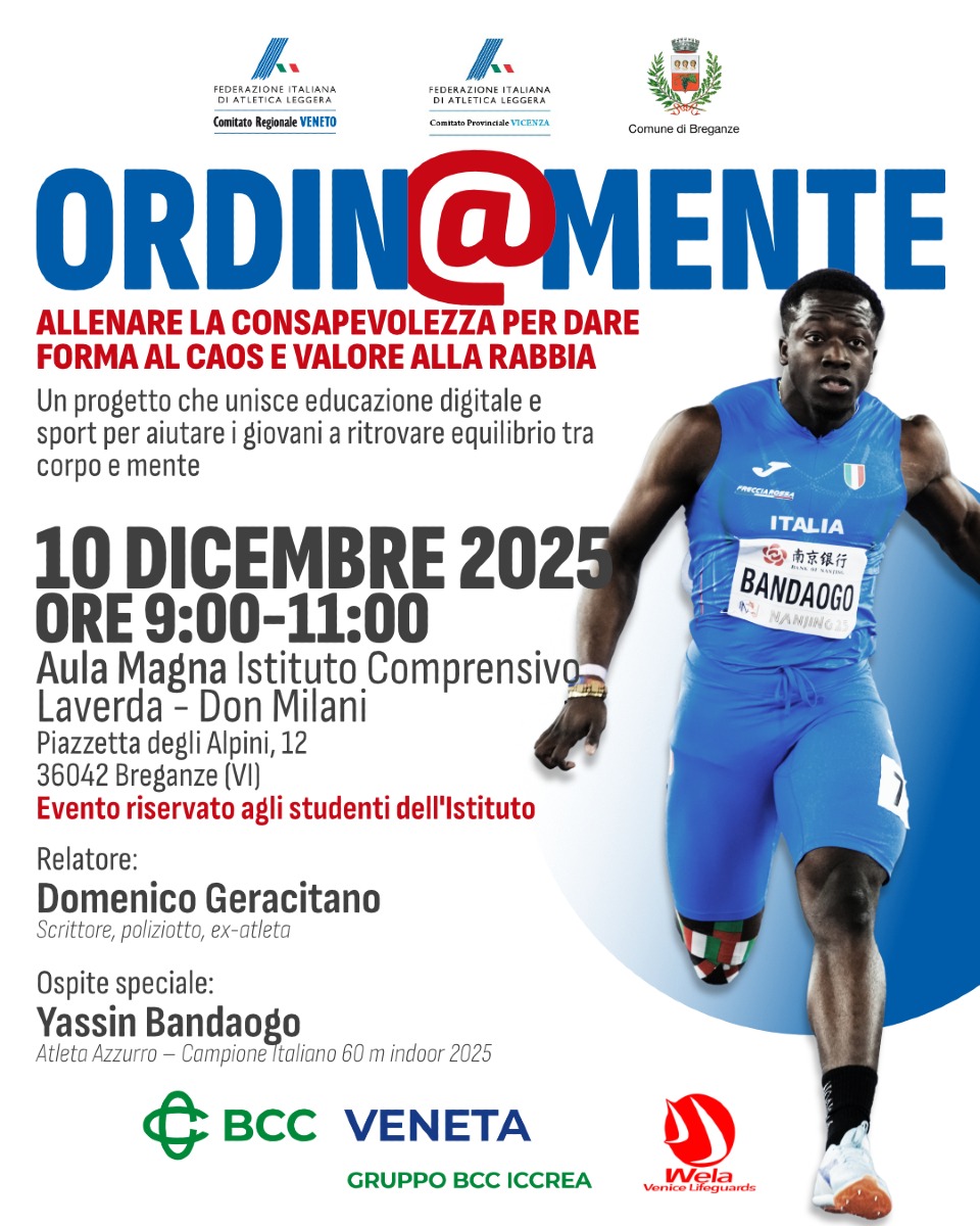 BREGANZE (PD) – Dopo il debutto a Trebaseleghe, torna in scena Ordin@mente, il progetto promosso da FIDAL Veneto che unisce sport, educazione digitale e crescita personale per aiutare i giovani a ritrovare equilibrio, motivazione e consapevolezza. La seconda tappa è in programma mercoledì 10 dicembre, dalle 9.00 alle 11.00, nell’Aula Magna dell’istituto comprensivo Laverda – Don Milani, dove studenti e docenti incontreranno il poliziotto-scrittore Domenico Geracitano e il velocista azzurro Yassin Bandaogo.
