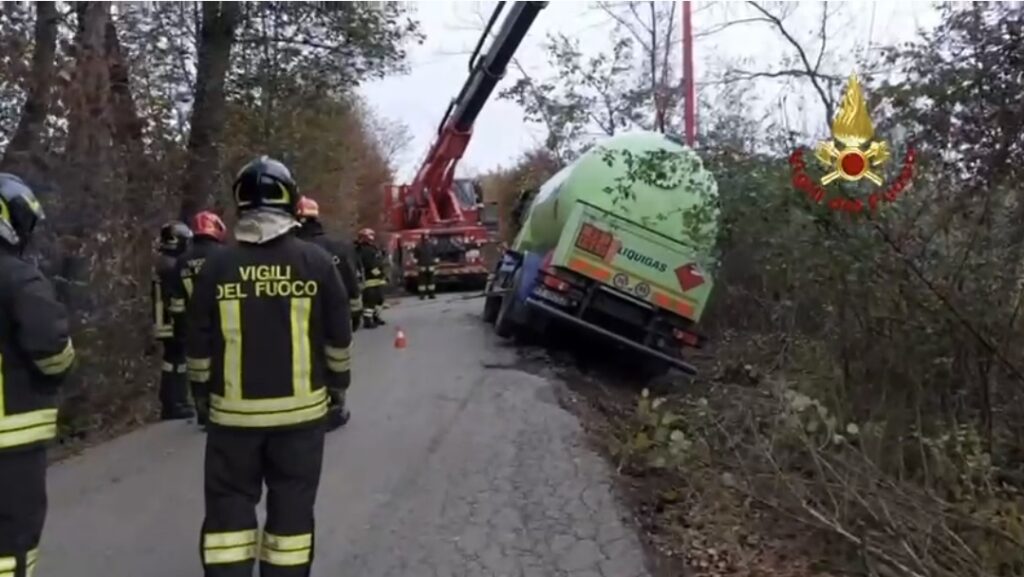 CESIOMAGGIORE (BL). Intervento dei vigili del fuoco in corso dalle 11:30 di lunedì 18 novembre, in via Villa delle Centenere, a Cesiomaggiore (BL) per un'autocisterna che trasporta 2.000 litri di Gpl, finita fuori strada: illeso l'autista.