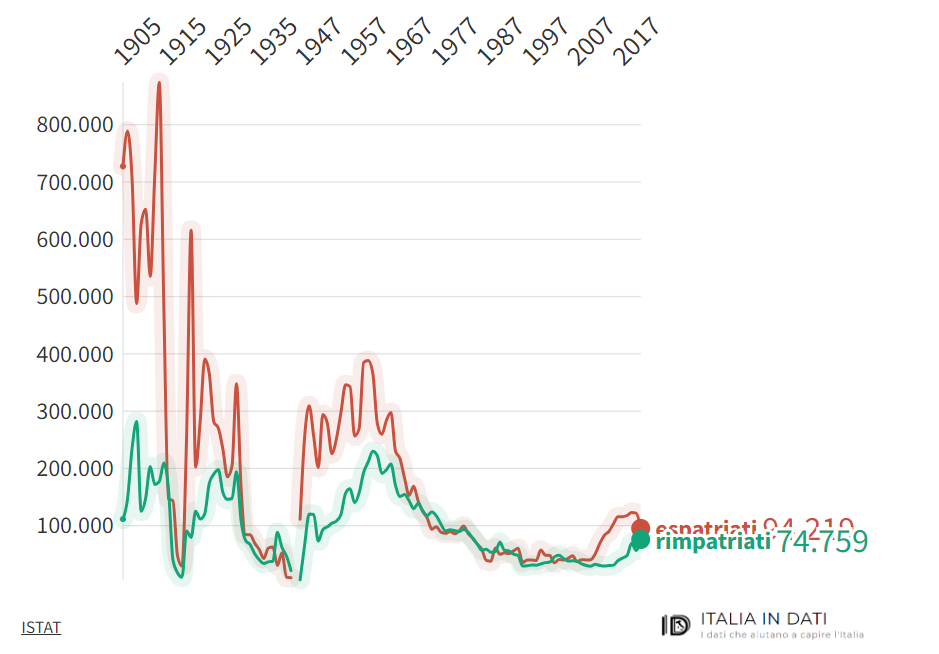 Oggi, i flussi migratori si sono attenuati ma la bilancia delle emigrazioni non si compensa con i flussi di ingresso. Significa che sono di più le persone che abbandonano il paese rispetto agli stranieri che scelgono di venire a vivere nel Bel Paese.