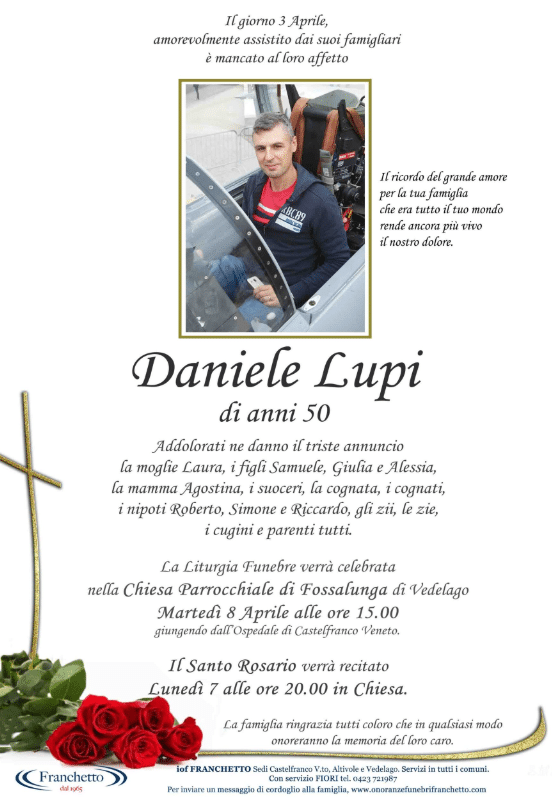 FOSSALUNGA DI VEDELAGO (TREVISO) – La comunità si stringe attorno alla famiglia di Daniele Lupi, scomparso a soli 50 anni dopo una lunga battaglia contro una malattia che non gli ha lasciato scampo. I funerali si sono svolti oggi pomeriggio alle 15 nella chiesa parrocchiale del paese, dove Daniele viveva con la moglie Laura e i loro tre figli: Samuele, Giulia e Alessia.