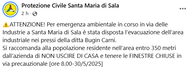 SANTA MARIA DI SALA (VENEZIA) – Oggi venerdì 30 maggio alle prime ore del mattino, una fuga di ammoniaca si è verificata presso uno stabilimento della zona industriale, provocando un’immediata evacuazione e l’intervento massiccio delle autorità.