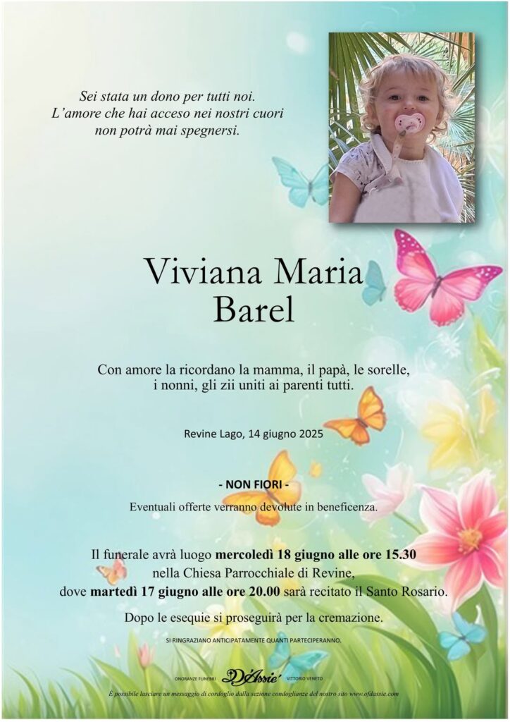 REVINE LAGO (TREVISO) – Una piccola bara bianca, un cuore di fiori rosa e un intero paese raccolto in silenzio. È questo lo scenario che ha accompagnato, nel pomeriggio di mercoledì, l’ultimo saluto a Viviana Maria Barel, la bambina di appena due anni tragicamente scomparsa a causa di un soffocamento domestico. Una cerimonia delicata e toccante, che ha visto una larga partecipazione di cittadini, autorità e familiari.