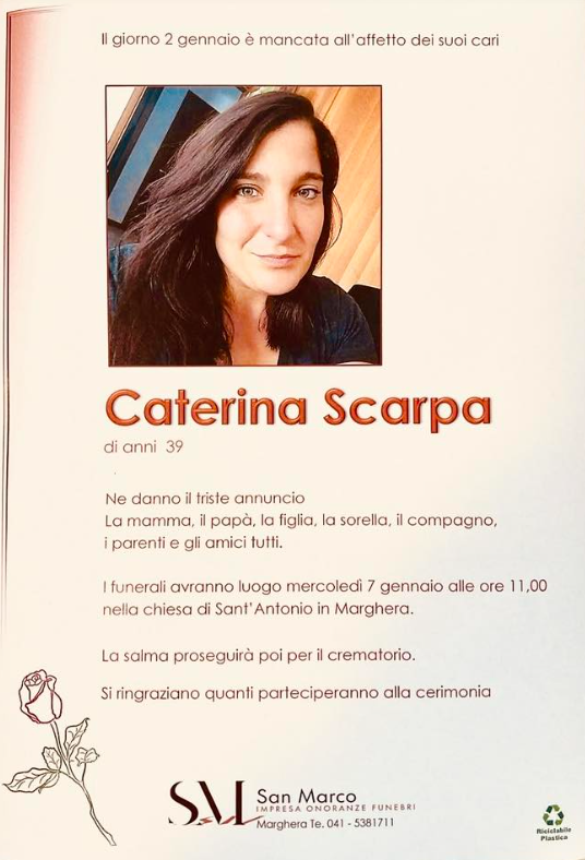 MARGHERA (VE) - Si svolgeranno mercoledì 7 gennaio alle 11 nella chiesa di S. Antonio a Marghera i funerali di Caterina Scarpa, venuta a mancare a soli 39 anni, martedì 2 gennaio, a causa di una grave malattia. Tantissimi i messaggi di ricordo della comunità in questi giorni.