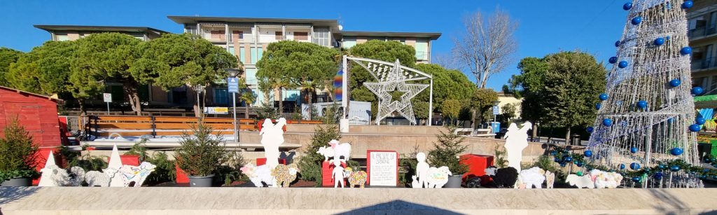 Le sagome dei bambini sono state Posizionate in piazza Fontana una parte, al centro del BIBIONE XMAS VILLAGE, e al Faro di Bibione l’altra parte, affiancata alla natività.