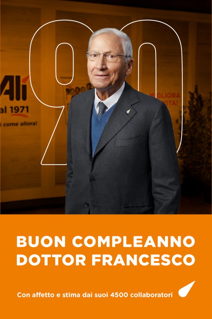 Un anno ricco di celebrazioni per la famiglia Alì che si conclude con un compleanno speciale: quello di Francesco Canella che di Alì, dal 1971, è Fondatore e Presidente e che oggi, 28 dicembre, si appresta a spegnere 90 candeline.