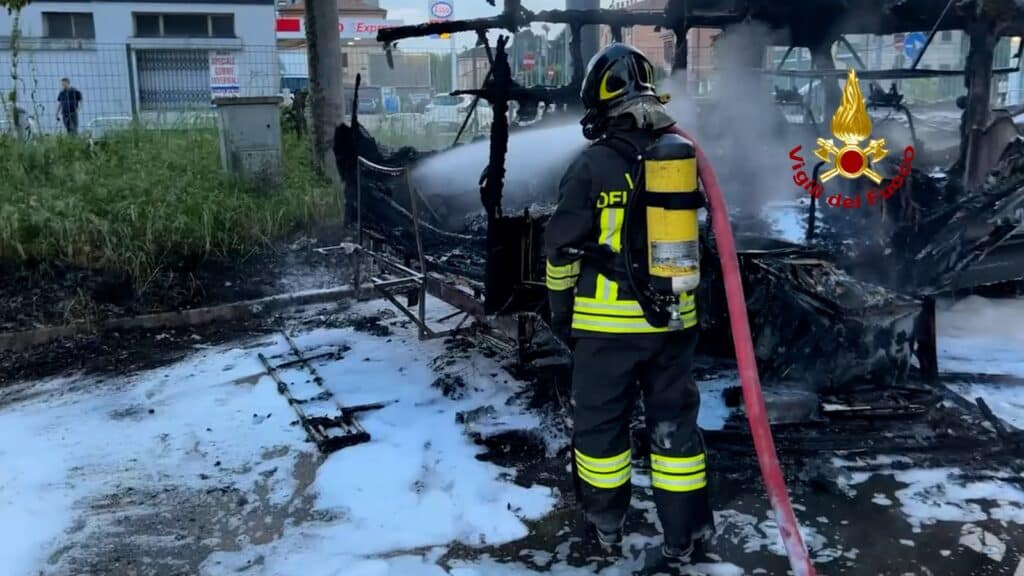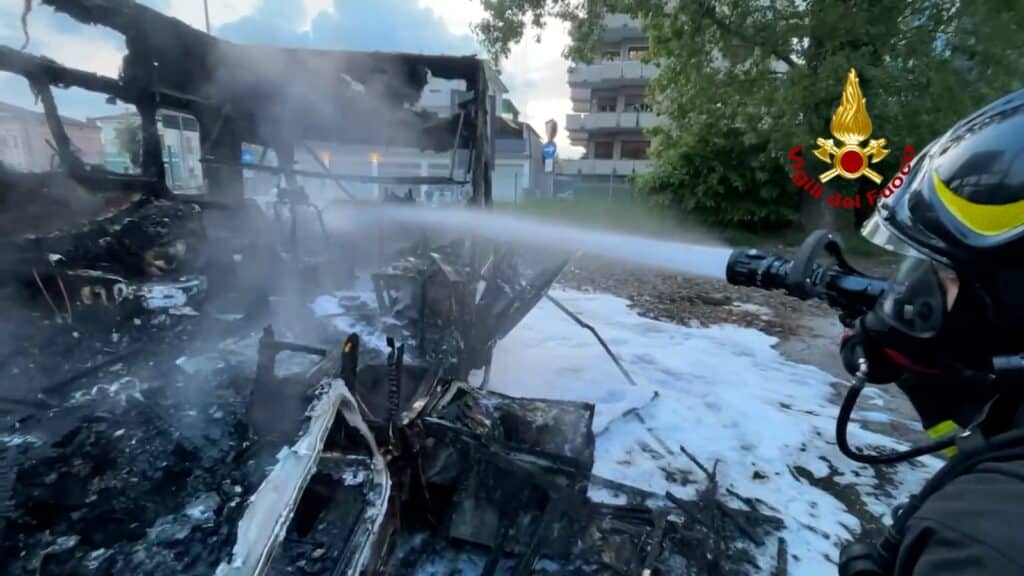Vicenza, Camper abbandonato prende fuoco e viene distrutto dalle fiamme. Operazioni di spegnimento complesse a causa delle bombole di GPL.