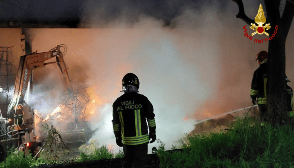 Incendio a Rosà in un capannone agricolo: vigili del fuoco al lavoro per spegnere le fiamme e mettere in sicurezza l'area.
