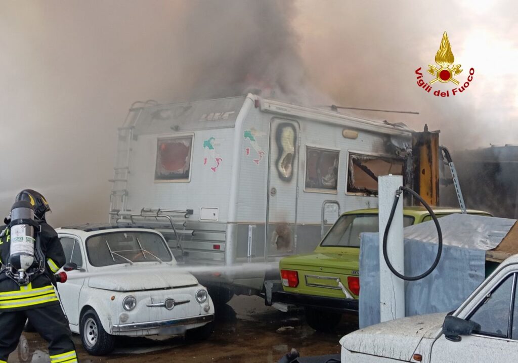 Carrozzeria in fiamme: danneggiate diverse auto, un camper ed attrezzature